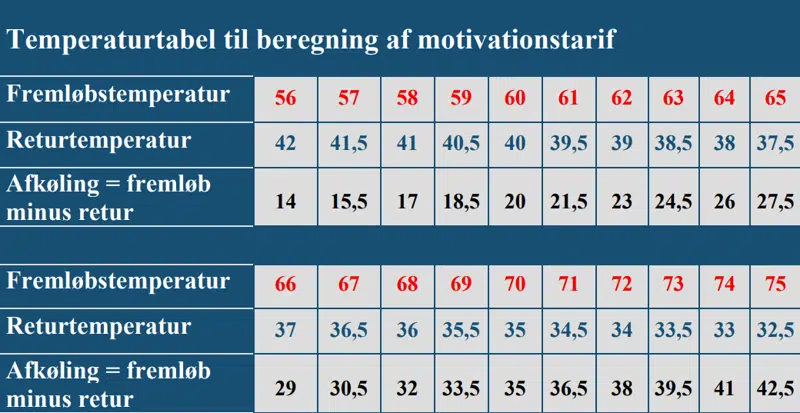 Derfor har vi en motivationstarif på to procent per grad, du ligger over den forventede afkøling. Der er dermed penge at spare, hvis du holder øje med, hvor varmt vand du sender tilbage til os.